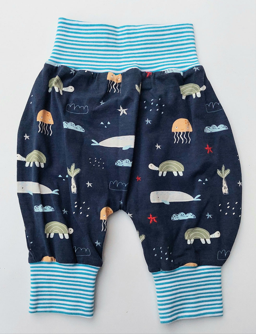 Damit ihr lange was von eurer Hose habt, werden Diese immer in Doppelgrößen von uns genäht. Am Anfang könnt ihr einfach die Bündchen einmal umschlagen, sodass unsere Hose mit euren Minis mitwachsen können.